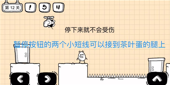 茶叶蛋大冒险镜中世界中有很多的关卡,不少玩家都来到了第12关,本关卡的提示是“停下来就不会受伤”,本关中停下来和站着不动无关,应该和暂停有关,接下来小编就给玩家们带来了第12关通关攻略,感兴趣的小伙伴一起来了解一下吧。