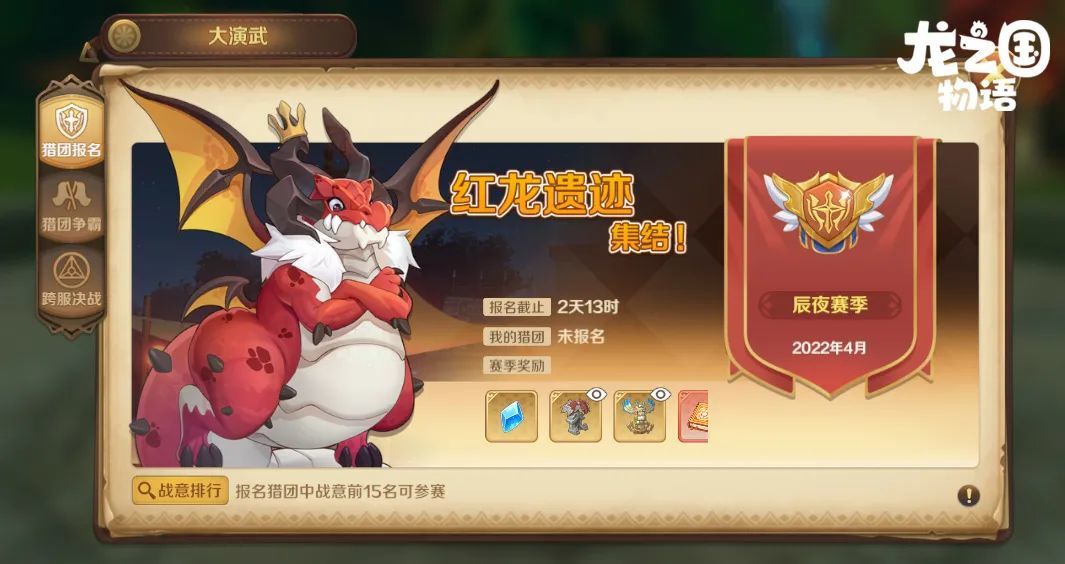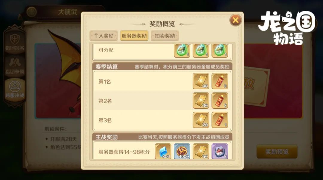 比赛当天主战猎团和协助猎团成员奖励:大量蓝钻、竞技点、龙晶重生符、大王召唤石(主战猎团奖励高于协助猎团)