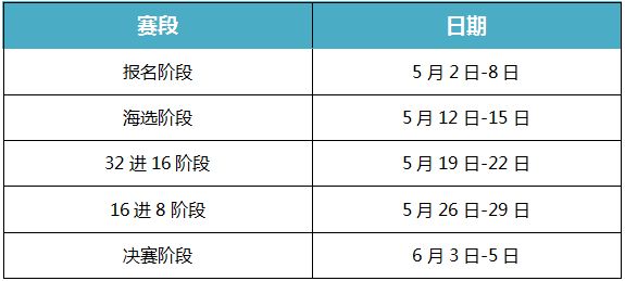 【赛事排期】本次大赛报名将在5月8日结束,海选阶段自5月12日起正式开战,完整赛程共经历15个比赛日,共计四大赛段。具体安排详见下表: