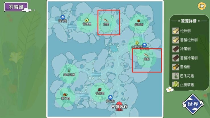 3、雾雪峰一共有两个钓鱼点,一个分布在中上方位置,另外一个分布在中右方位置。
