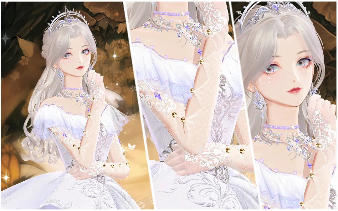 虽然都是童话风格的服饰,但【黎明梦境】和【绮丽童话】却有着截然不同的气质。【黎明梦境】以浅长春花蓝为主色调,刺绣花纹繁复精美,经典的剪裁和一字肩设计尽显华贵。配套发型【曦色冠冕】则是精致编发【配上璀璨的皇冠,高雅又不失柔美,换上它,你就是王座上高贵的加冕女皇!