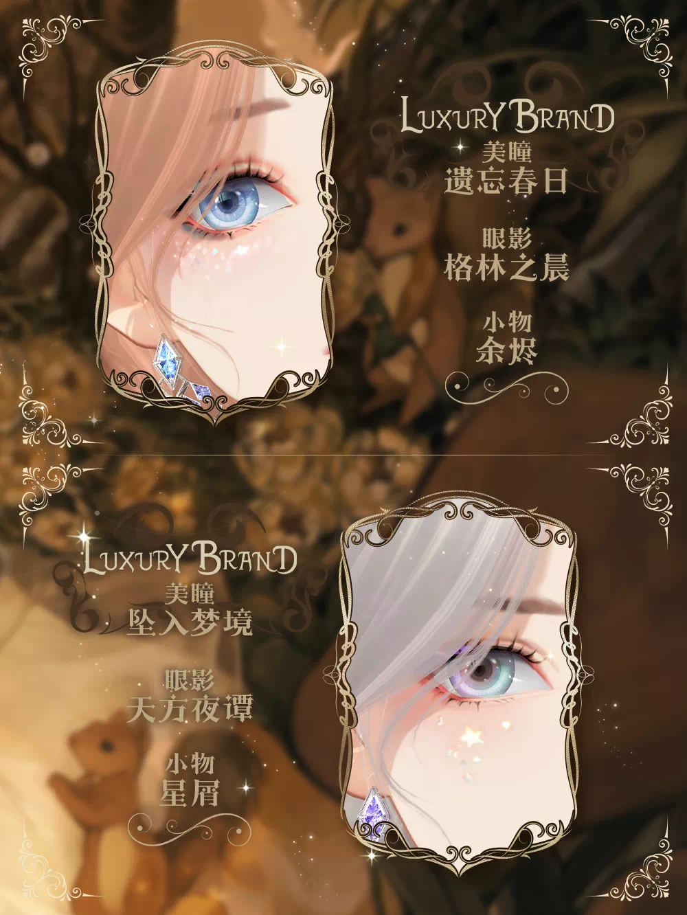 和顶奢一起上线的,还有与之相配的妆容小物。湖蓝色的美瞳【遗忘春日】,清新自然,紫绿撞色的美瞳【堕入梦境】,深邃的眼眸中仿佛盛着少女神秘绮丽的梦中景象。眼下的装饰,则如同流星划过了落下的星屑,如梦似幻。
