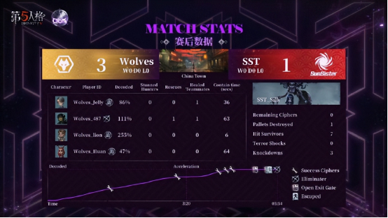 很快,第一场比赛也是拉开了帷幕。双方选手都保持着不错的状态,但是第一场比赛狼队要更胜一筹。上半场里面,狼队的求生者选手运营的非常顺利,利用祭司通道,让SST的选手晕头转向,在牺牲一位选手的情况下,完成了三跑,为队伍拿下了巨高的分数。而下半场就到了Alex发挥的时间了,他选出了赛场上面比较强势的破轮。