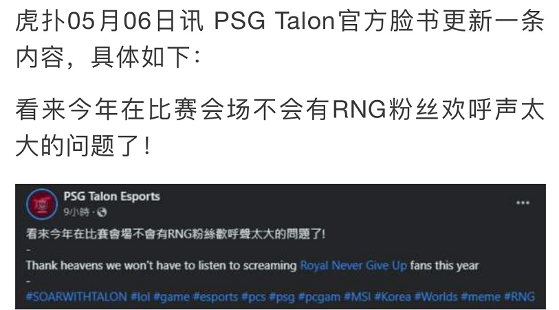 然而让人没有想到的是,PSG官方却公然发文嘲讽RNG,或者说是内涵RNG。 PSG官方首先配图表示今年不用耳塞了,随后发文表示,看来今年在比赛会场不会有RNG粉丝欢呼声太大的问题了。这样的行为确实让很多网友都没有想到,也不知道他们哪来的勇气敢这样发文。