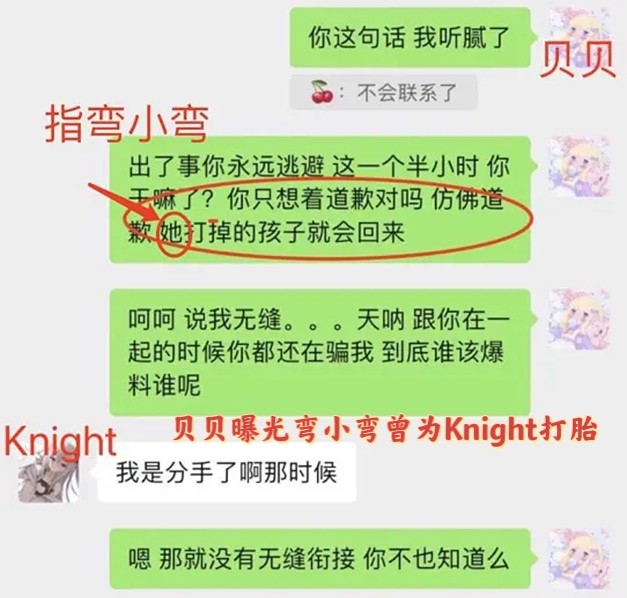 大概是Knight本人也没有料想到,辛苦在粉丝心中营造的人设,会被两任女友彻底毁掉,事情的起因发生在Knight前女友弯小弯这边,这位前女友在网络中公开曝出,自己受到了Knight现女友的骚扰,而且直接说出Knight和现女友贝贝无缝衔接,之前在两人中间充当了第三者,而后现女友贝贝也是进行了回应,表示自己和Knight恋爱是在他们分手之后,就此两人开始了网络互撕。
