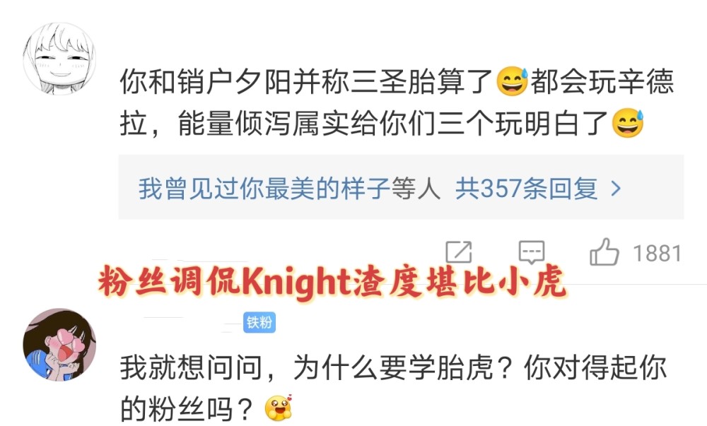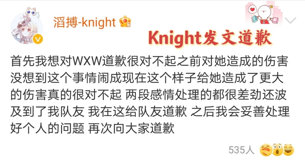 Knight可能也是发现事情愈演愈烈了,赶忙现身试图劝阻两人,Knight发生对事件进行了道歉,把责任都揽在了自己身上,表示没有处理好感情的问题,影响了粉丝和队友的情绪,而小天也是迅速点赞了Knight进行了力挺,看样子没有被好兄弟的女友影响心态,不过事情远远没有就此为止,毕竟出于女生的不服输心理,贝贝必然也要曝出更大的猛料的。