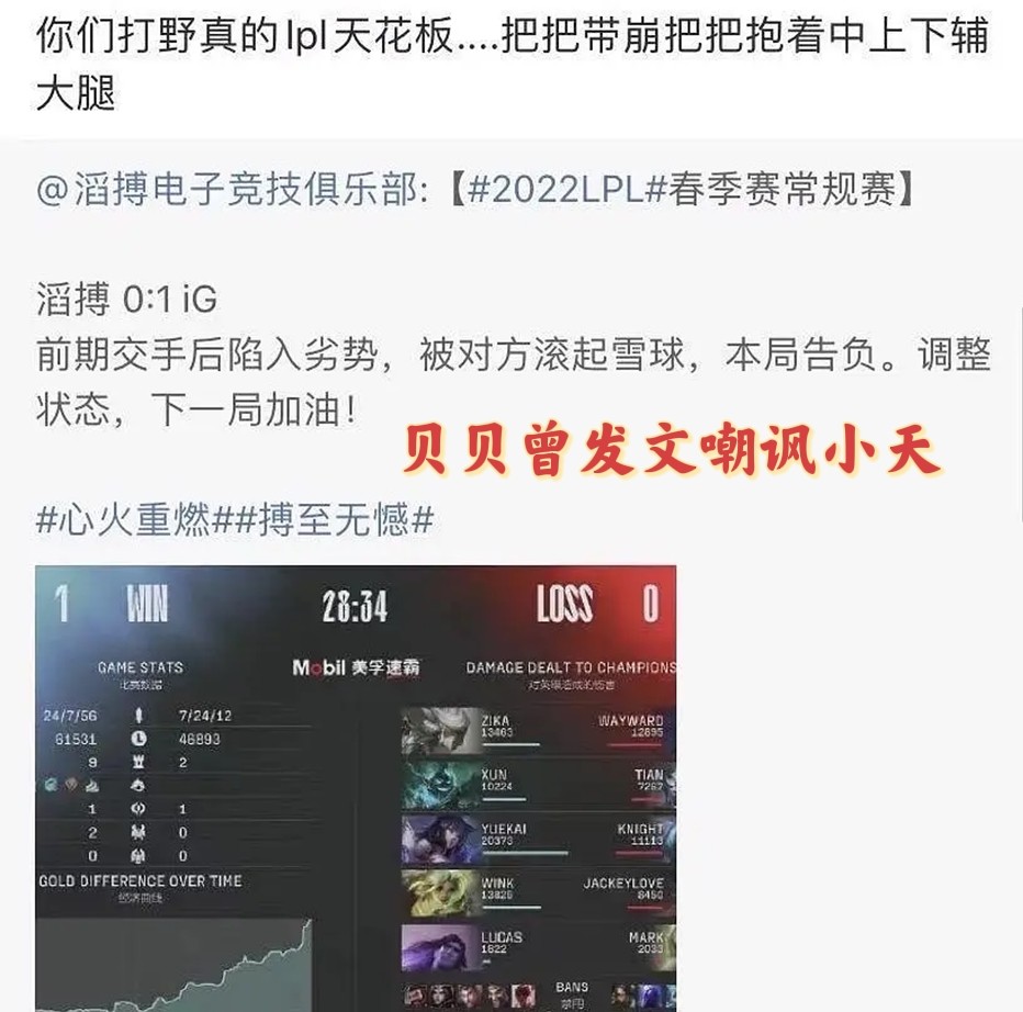 在Knight两任女友互爆猛料的同时,一则关于小天的事件也被揪出,此前TES战队在输掉一场比赛之后,Knight现女友贝贝曾发文嘲讽,直指小天是抱着中下辅的大腿,而且每局比赛都是带崩,这些话被曝光之后,很多LPL粉丝自然是无法接受了,毕竟如此嘲讽男友的队友,粉丝们实在看不下去,而且小天本身拥有很多粉丝,粉丝们自然不能接受这样的事情。