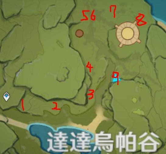 上图所示是攻略组玩家制作的砍萃华木路线图,搭配上双风和长腿角色,一路从标记点1砍到标记点9然后再回到标记点1,如果玩家速度快的话,整个过程甚至用不了2分钟就可以完成。不过需要注意的是:刷第一遍的时候需要先灭掉丘丘人。