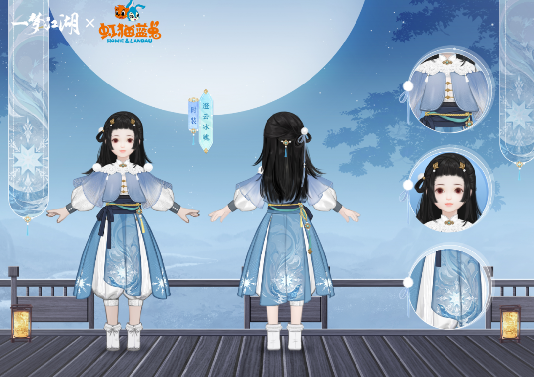 女款时装以蓝兔少侠和她手中的冰魄剑为原型,唤作“澄云冰魄”。时装·澄云冰魄以冰蓝色为主色调,霜雪冰晶顺着水波点缀裙袂之间,宛若玉蟾宫主蓝兔挥舞冰魄剑时,散发出冻彻天地的凛洌寒气。