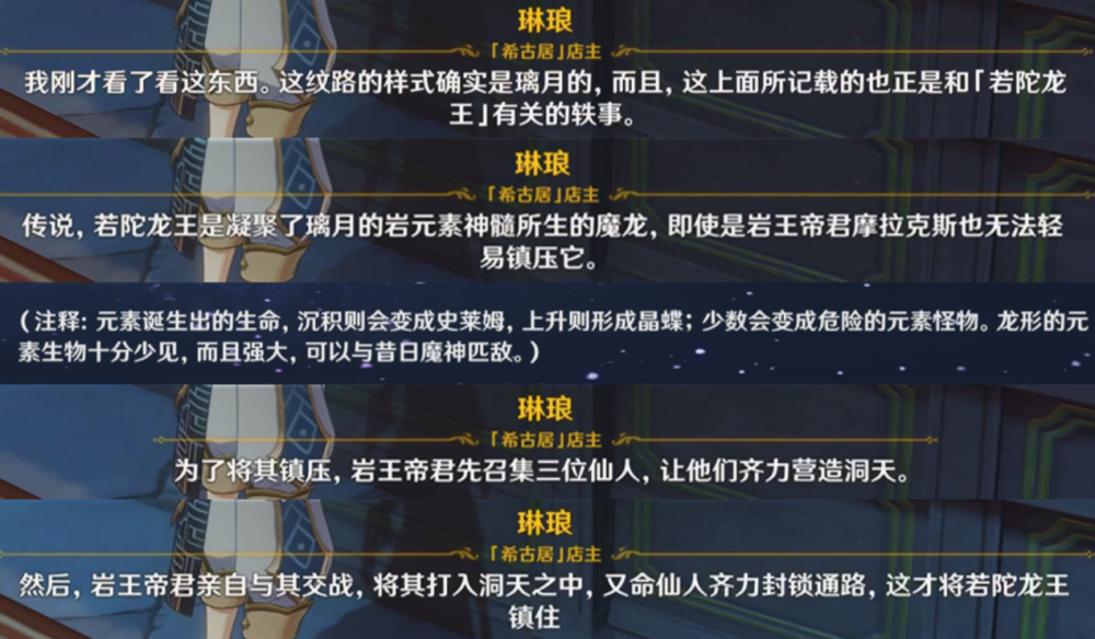 首先是“璃沙宝藏”这个任务,从青墟浦、灵矩关、遁玉陵解谜后可以各获得一个无名宝藏,交给璃月港古玩店店主琳琅的时候,琳琅会直接明说:这些东西就是记载若陀龙王的古物。