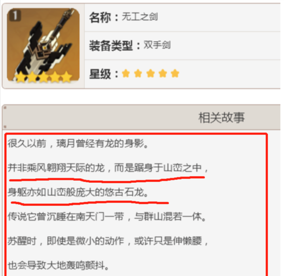 首先,游戏里也早有提示,五星大剑“无工之剑”的介绍明确提示说:璃月的龙并非乘风翱翔天际的龙,而是踞身于山峦之中,身躯亦如山峦般庞大的悠古石龙。