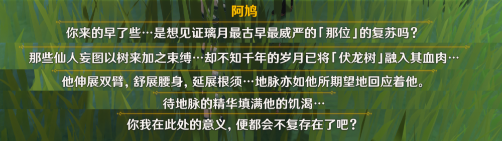 伏龙树下面有个谜语人NPC“阿鸠”,这个小姑娘后来也证实是若陀龙王的阴暗面化身。阿鸠也提示了,本来仙人们用这棵树把龙王封印,但龙王反而把伏龙树融入血肉,开始吸取地脉精华。
