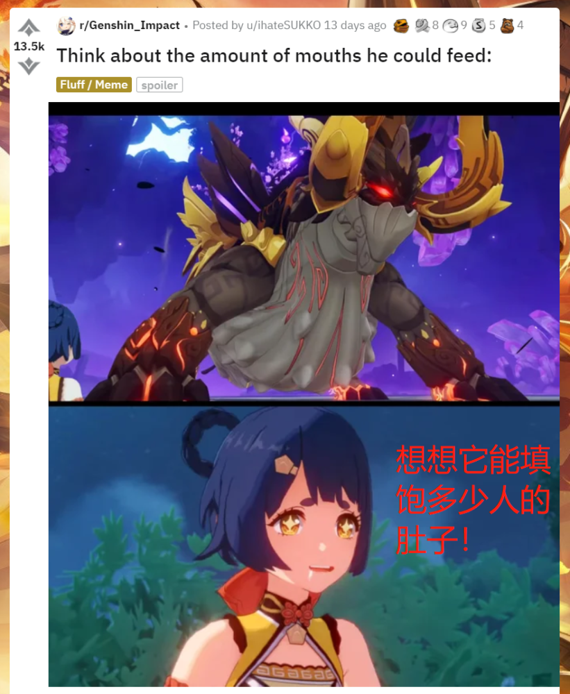 原神1.5版本登场的若陀龙王最近意外蹿红、火得离谱。尤其在海外reddit论坛,1.5刚开的时候几乎被若陀的帖子“屠版”,各种梗层出不穷。有人玩起“若钟CP”梗,有人亲切地称它是“肥陀”、“大蛤蟆”,还有香菱粉丝兴奋地说道:“哇!想想它能填饱多少人的肚子!”