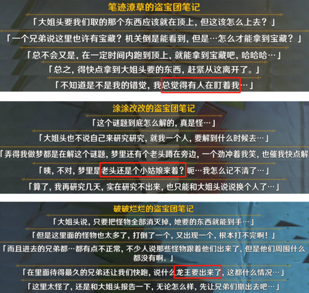 然后是天遒谷,我们能在3座塔楼废墟中各找到一本盗宝团留下的笔记。有的盗宝团成员总感觉有人盯着他(龙王通过意念观察外界),有的盗宝团成员梦见又似老头又似小姑娘的人(龙王侵入梦境托梦),而有的盗宝团发现兄弟疯了,喊着“龙王要出来了,快跑”(龙王直接精神控制)。