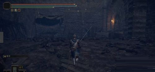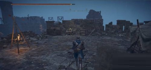 2、从骸骨堆右边的断墙过去进入城堡内部,找到梯子爬上城墙。