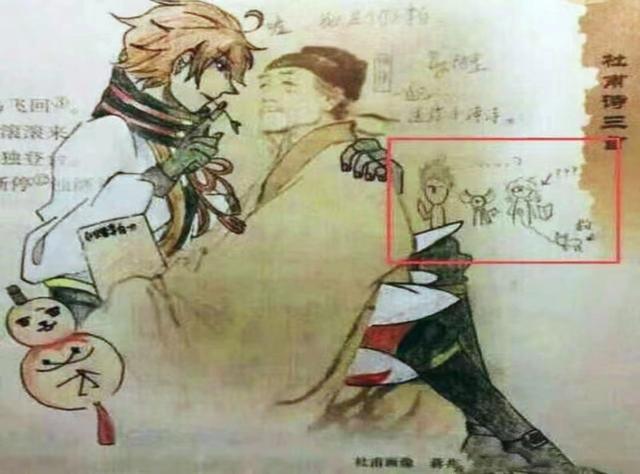 初中的孩子似乎格外的具有奇思妙想,他们也非常大胆,敢于把这些奇怪的想法展现出来,甚至是连语文课本中的古代著名诗人的插画都不放过。在这些孩子的课本上,诗人们都纷纷化身成游戏人物,简直都要组合成一个吃鸡小分队,想必这些诗人的棺材板都要摁不住了。