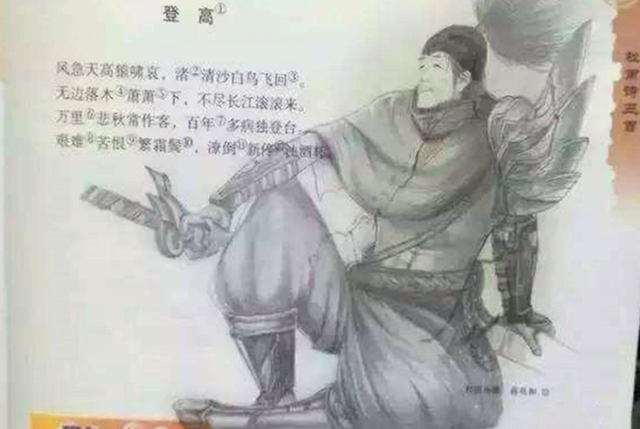 在语文课本中诗人的画像一般都是半身像或头像,有一些学生就会奇思妙想的将它补成一个全身像,但是不要期待是那正儿八经的画像。经过他们创作之后的画像往往会让人感觉心头一震,下面这幅画就把诗圣本人变成一个做法术的人,不得不说这个学生的画画功底还是很强的。