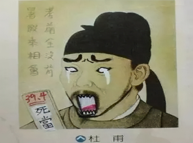 当看到这幅画的时候,你很难想象到这是诗人杜甫,虽然只是进行了简单的涂改和添加,但是这幅画的寓意却是非常深刻的。图中杜甫老泪纵横,眉头紧皱,面前放着张39.4分的答卷,旁边的文字写道“考前都没背,暑期来相会”,可以说非常形象的展现了这个学生的畏考心理。