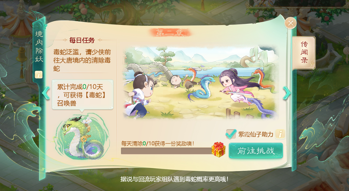 在活动期间,侠士组成三人及以上队伍参与除妖,每日使用寻妖罗盘铲除10条毒蛇就能获得丰富的奖励!