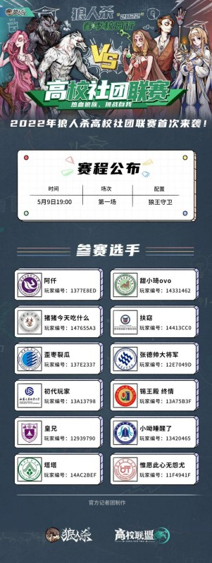 本次高校社团联赛比赛期为5月9日——5月13日,除参赛选手外,狼人杀特邀来自于西北农林科技大学的好人风向标、沈阳航空航天大学的中舒服|梦游、北京体育大学的狼美男LEO三位高校学子担任本次比赛的解说,玩家们可前往主播直播间观看比赛的第一现场。