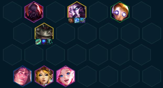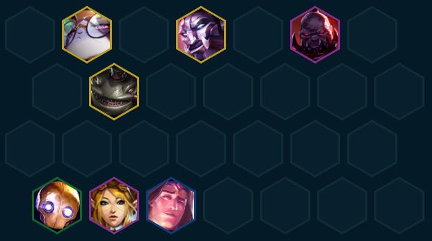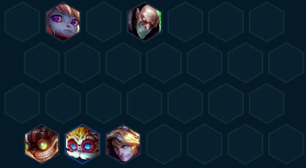 过渡介绍波比+炼金+炸弹人+大头+EZ组成3约德尔3发明家2极客,利用约德尔的经济上人口,波比和炸弹人能3就3,输出装先做给大头打工。
