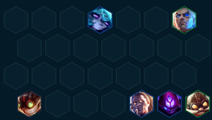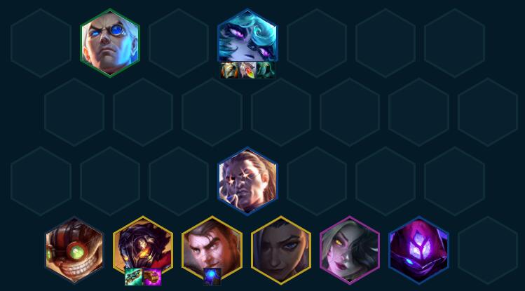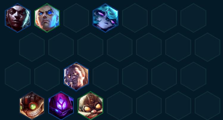 这套阵容的策略是运营速八找金克丝和维克托,2-1直接拉四,开3约德尔2极客等前期强力羁绊打前期连胜,2-5升五人口压制,上机器人开2保镖或是根据羁绊去找其他质量卡打工保证连胜状态后期才有容错找五费C位。选秀优先保证蓝buff再考虑其他装备。