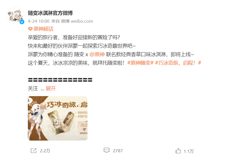 有派蒙陪伴的旅途总是一路充满乐趣,跟随联动同步开启的还有「巧冰奇旅」主题创作投稿活动。玩家们可以在微博话题#巧冰奇旅,启程!#中发布投稿,分享随变与派蒙的同框照片,一起加入这场探索巧冰的奇妙旅程中。许多有趣的二创作品由此诞生,Q版条漫、派蒙吃冰表情包、派蒙组队一斗冒险之旅小动画等内容百花齐放,将可爱的「应急食品」与冰淇淋巧妙结合。