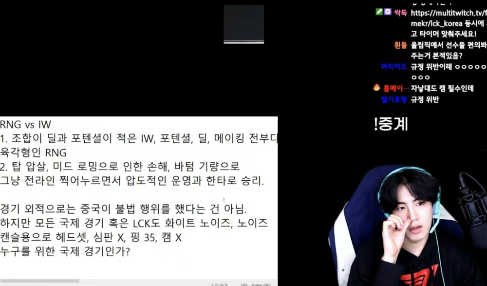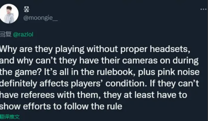 其中前职业选手Flame就对此发表评论称“并不是说LPL做了违规的行为,但在所有国际LOL比赛当中选手,都应该为了消除外部声音而戴上持续播放白噪音的头戴式耳机。而RNG明显没有做到,更重要的是,RNG的比赛当中没有裁判,ping值是35,甚至连镜头都没有,这明显是不合规定的行为,而除了延迟以外其他条件都是很容易被满足的,希望RNG能为了比赛公平主动履行相应义务吧”