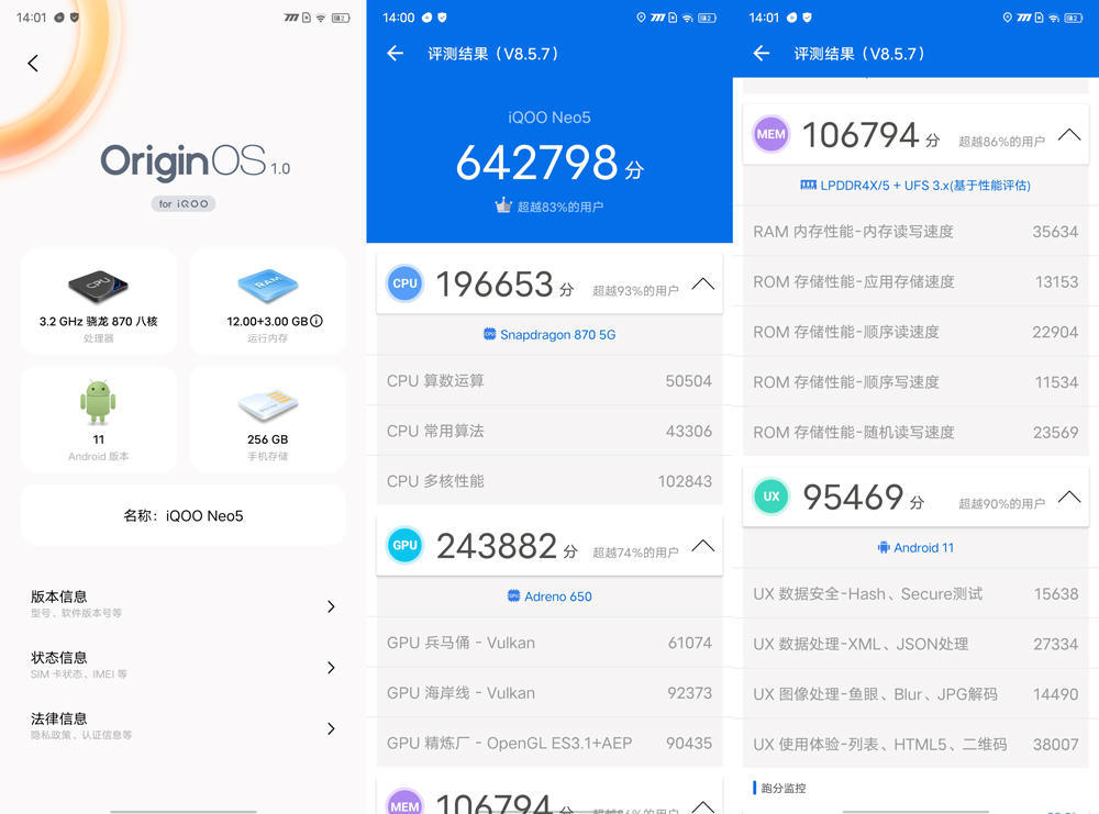 作为iQOO Neo系列的新品,为了保证产品的游戏性能,iQOO Neo5采用了今年主流的骁龙870芯片+LPDDR4X内存+UFS 3.1闪存的组合。骁龙870是高通今年的新品,定位仅次于骁龙888。这颗芯片使用了7nm工艺以及“1+3+4”八核心三丛集架构,整体性能提升了10%。此外,该机还配备有内存融合技术,可额外增加3GB内存。