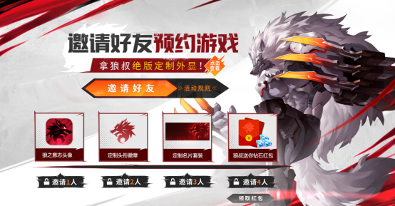 此外,当玩家邀请好友数量达到4人时,狼叔就会给你发红包啦!活动红包可随机开出多档钻石奖励,从700钻石到1556钻石不等,所有活动奖励将会在游戏上线后,以邮件的形式发放到玩家创建的第一个账号上。