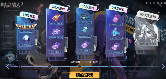 除了邀请好友的特殊奖励,每一位参加预约的小伙伴,还能解锁五档预约奖励,活动奖励包括纪念称号、装备芯片、强化材料和十连招募券等,达成百万预约将会解锁终极奖励:人气猎人角色冰魄!