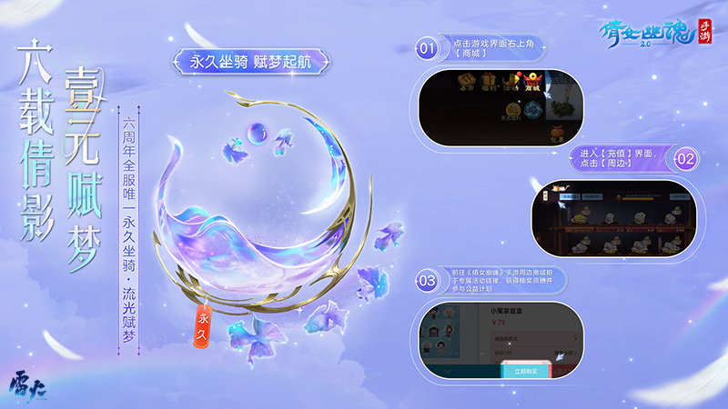 【流光赋梦】即将在5月19日晚的六周年庆直播中抽奖送出!1元即可参与抽奖,并捐献爱心加入公益计划。【流光赋梦】能带给玩家遨游三界的快乐,也将成为全体倩女手游玩家关心社会,关照现实的载体。