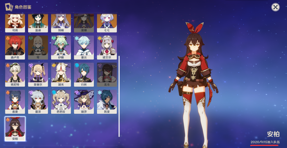 在角色图鉴内,有记录你的角色加入队伍的时间,UP主的安柏是第一个加入的,加入的时间就是9.15号公测当天!足够证明自己是老玩家了。