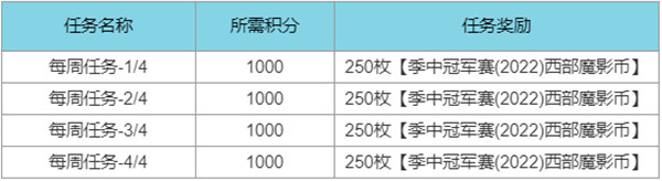 该任务对所有玩家开放,每位玩家只能完成一次,完成任务获得60枚季中冠军赛(2022)西部魔影币与季中冠军赛(2022) 西部魔影 图标。