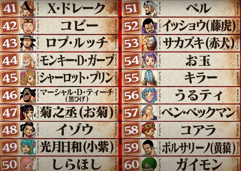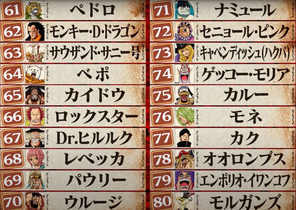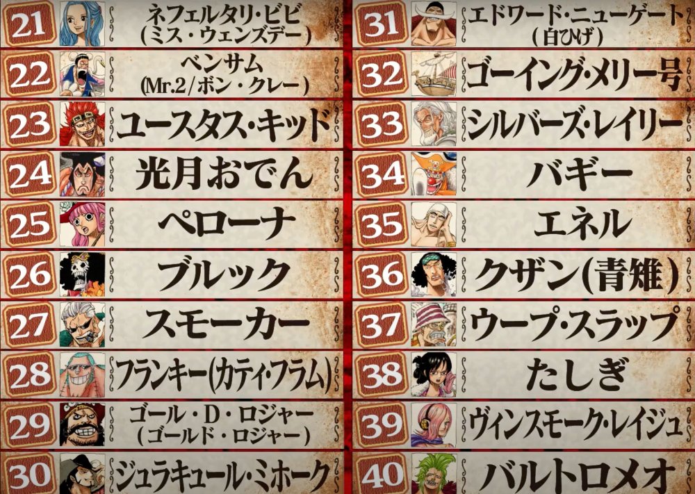 第40名巴鲁托洛米奥,39蕾玖,38达斯琪,37乌普斯兰普,36青雉,35艾尼路,34巴基,33雷利,32黄金梅丽号,31白胡子,30鹰眼米霍克,29罗杰,28弗兰奇,27斯摩卡,26布鲁克,25佩罗娜,24光月御田,23基德,22Mr.2冯酱,21薇薇公主,下面是后篇重头戏。