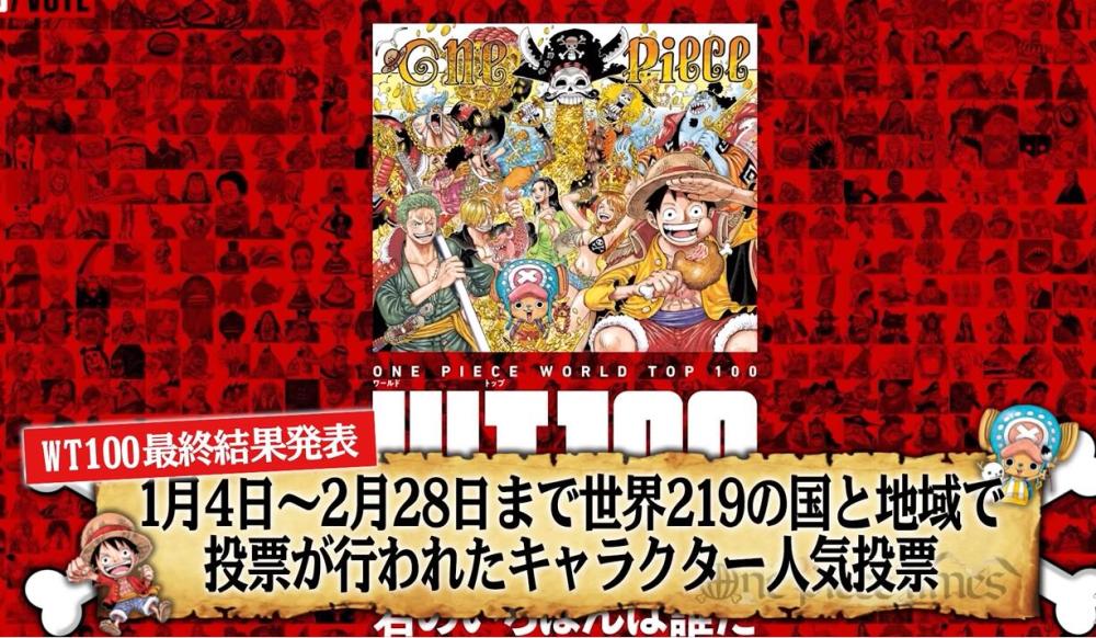今年1月-2月海贼王官方举办了一场世界范围内的ONE PIEC角色人气投票“World Top 100”。参与投票的粉丝来自全世界的219个国家和地区,总投票数超过了1200万票。 这也是第1回世界范围内的大型角色人气投票,目前结果已经出炉我们一起来看看吧。