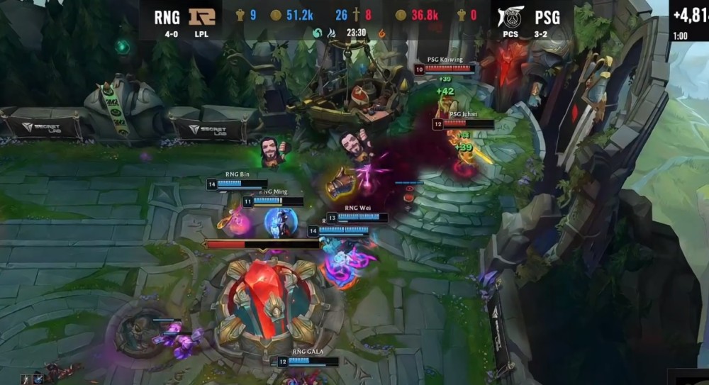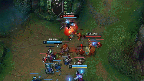 前期打花之后,RNG战队没有放过PSG,继续疯狂开团,先是梦魇一波关灯开团,狐狸进场魅惑轻松击杀了薇古丝,从这波就能看出来,梦魇关灯能配合的英雄还蛮多的,尤其是狐狸这种能快速RE跟上控制的英雄,以及慎这种一起飞的英雄效果都很好。