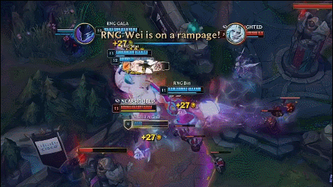 之后RNG战队又策划一波下路越塔,率先击杀ADC,然后在之后继续进攻,追击过程中又击杀了女坦和佛耶戈。