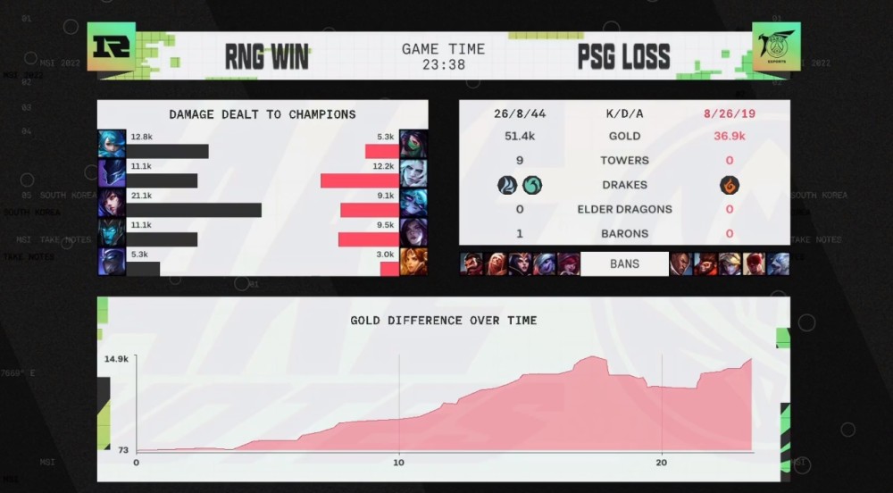 结果这场比赛RNG战队打出了非常快的进攻节奏,前期直接打花,轻松赢下比赛后收获本次MSI的第八场连胜。