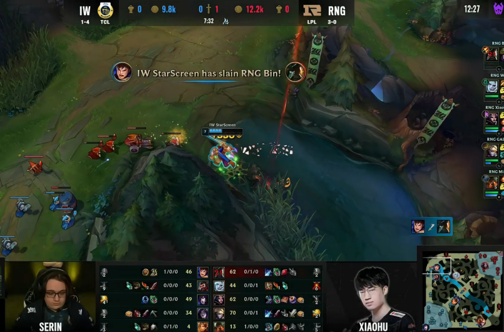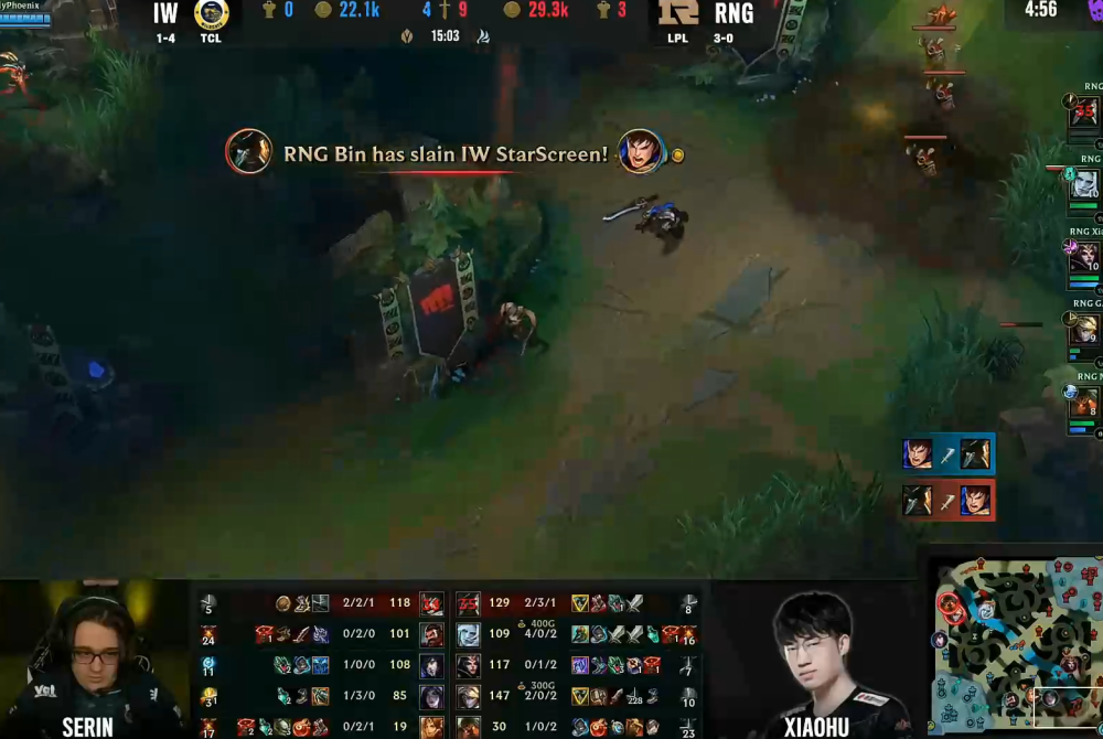 不过IW男枪开局换野保上半区,导致下路卡莎炸穿,中路一血塔也被先锋推平,盖伦那波单杀对局面没啥影响,RNG战队15分钟就已经领先七千经济!此时BIN船长试图找盖伦报仇,炸桶双火刀再用闪现躲Q,极限操作毫无瑕疵,但还是被盖伦大招点燃换掉了,德玛西亚之力专克一切花里胡哨!