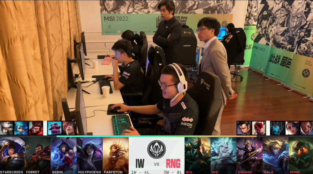 IW战队选用狐狸、卡莎、女坦、盖伦、男枪;RNG战队选用EZ、佛耶戈、妖姬、泰坦、船长。