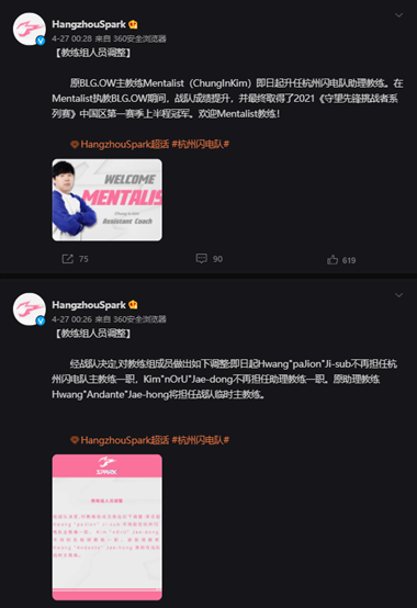 4月27日凌晨,杭州闪电队紧急宣布调任原助教Andante为战队临时主教练,提拔BLG.OW主教练Mentalist担任闪电队助教。