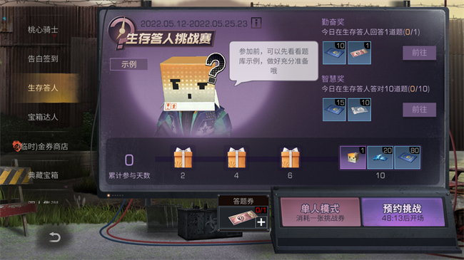 5月12日-5月25日23时,幸存者们可以参加生存答人挑战赛的答题活动。活动期间,不仅题库的题目有了新的变化,幸存者们还可以额外领取包含微晶在内的累计奖励。记得准时回到温馨热闹的家园,参加生存答人挑战吧!