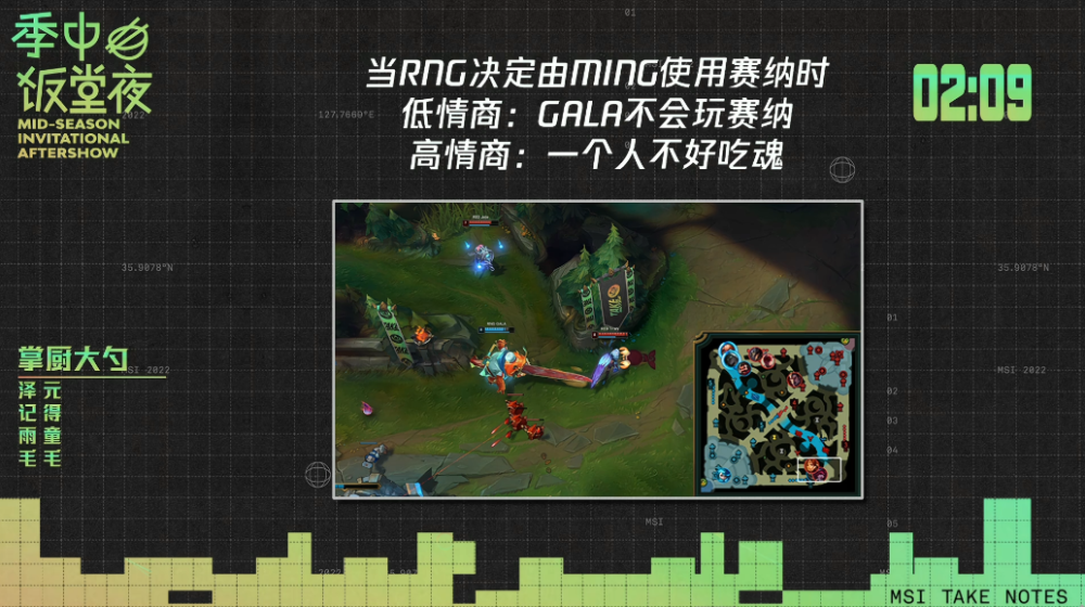 这个梗自然就是RNG双人路经常会遇到的情况,小明不断游走,而GALA在下路抗压。不过,让小明选择赛娜之后,因为赛娜需要通过队友来收集魂,所以导致赛娜不太好游走。只不过,即便是拿出赛娜,依旧是无法阻挡小明一颗喜欢游走的心。