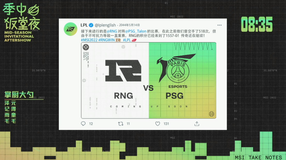 关于重赛,我们是知道的了。不过在《季中饭堂夜》中,重赛的RNG拿下了1557-0的战绩。其中,1557这个梗就是发生在2019MSI季中冠军赛期间,当时的IG战队在面对T1的时候,创造了15分57秒MSI用时最短的记录,而15分57秒这个数据就被广大LPL粉丝们称之为1557。之所以在本届MSI中提起,更多还是因为T1参加了本届MSI。另外,在这个吐槽重赛的对战图片中,官方还特意使用了RNG对阵PSG的图。因为PSG在得知RNG重赛的消息之后,进行了不厚道的调侃,这也让他们成为了本届MSI中最让LPL粉丝们讨厌的战队之一。
