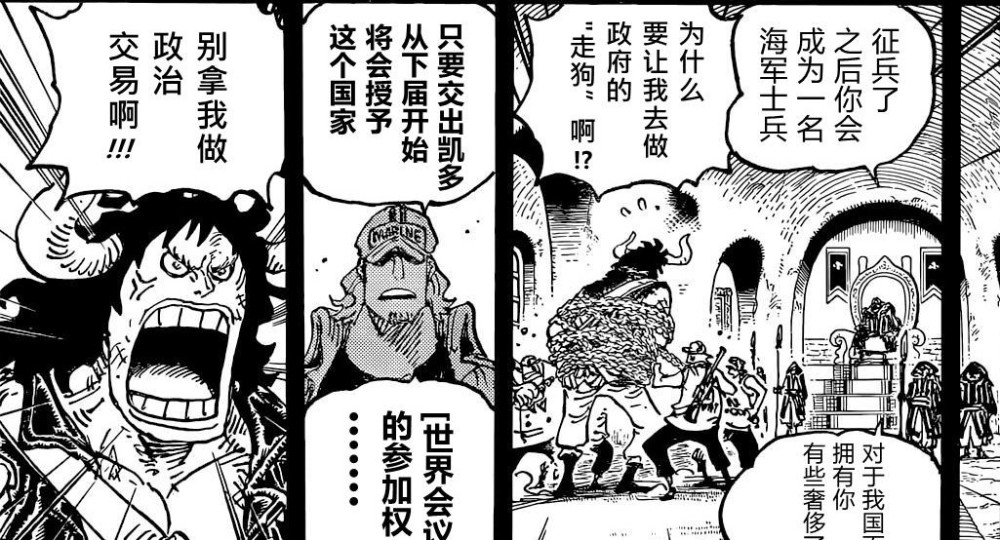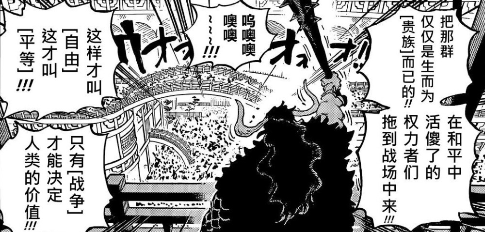 在年轻的凯多眼里,天龙人贵族就是一群恶龙,至高无上的地位,让他们养尊处优,享受着和平的生活,这是不对的。凯多要做的,就是把这些家伙拖入战争,让战争来检验他们的价值,看看他们配不配当世界的主人,这就是凯多认为应当追求的世界,也是1049话的标题。