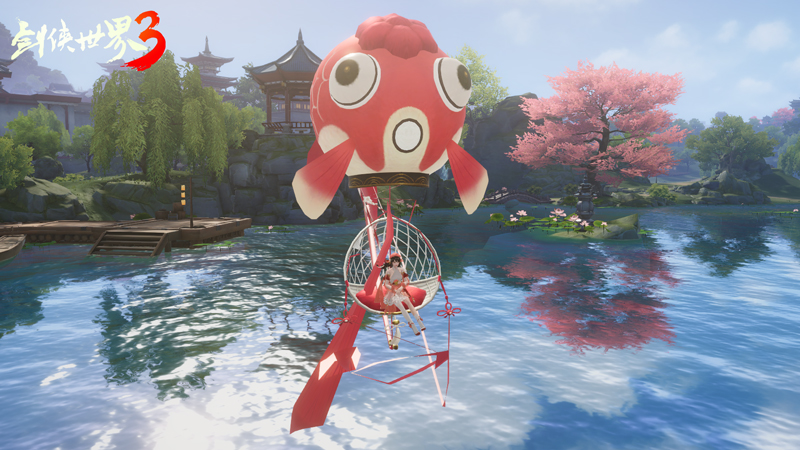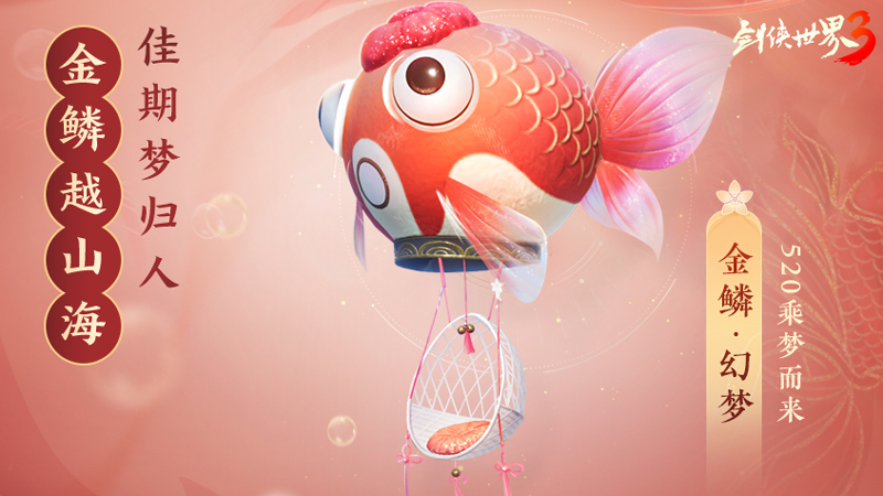 携手侠侣,坐看山河,是否是每位少侠的愿望?为迎接520,《剑侠世界3》将推出全新双人坐骑「金鳞幻梦」。本次采用符合520气氛的桃色做整体色调为设计,以红色同心结飘带连接呆萌可爱的鲤鱼气球和白色梦幻镂空秋千,再点缀白色小花,可谓浪漫气息满满。少侠可与侠侣同乘,悠哉行江湖,坐看山河风光!