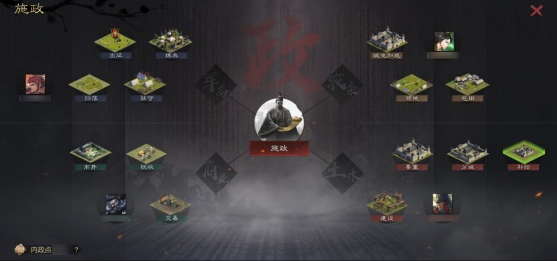 游戏中为原有的武将卡增添了“文臣”的属性,使之能够在武将与文臣两种形态中自由切换。并根据古代士农工商四个维度,结合武将本身的生平背景,在军务、农桑、土木、商业四个方向进一步挖掘内政机制的深度。
