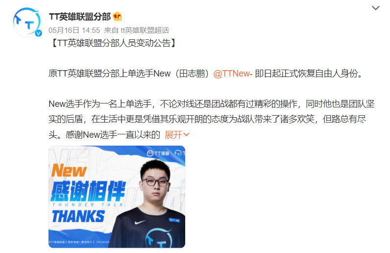除了MSI之外,从上个月开始,LPL已经开始了转会期。虽然现在还没有什么太大的动静,但是到了5.30号的时候,相信转会期的一切动作,就会浮出水面。虽然说现在还没有队伍官宣引入什么选手,但是却有队伍官宣一些选手的离队。比如说TT战队,最近就官宣了自家上单选手New的离队。