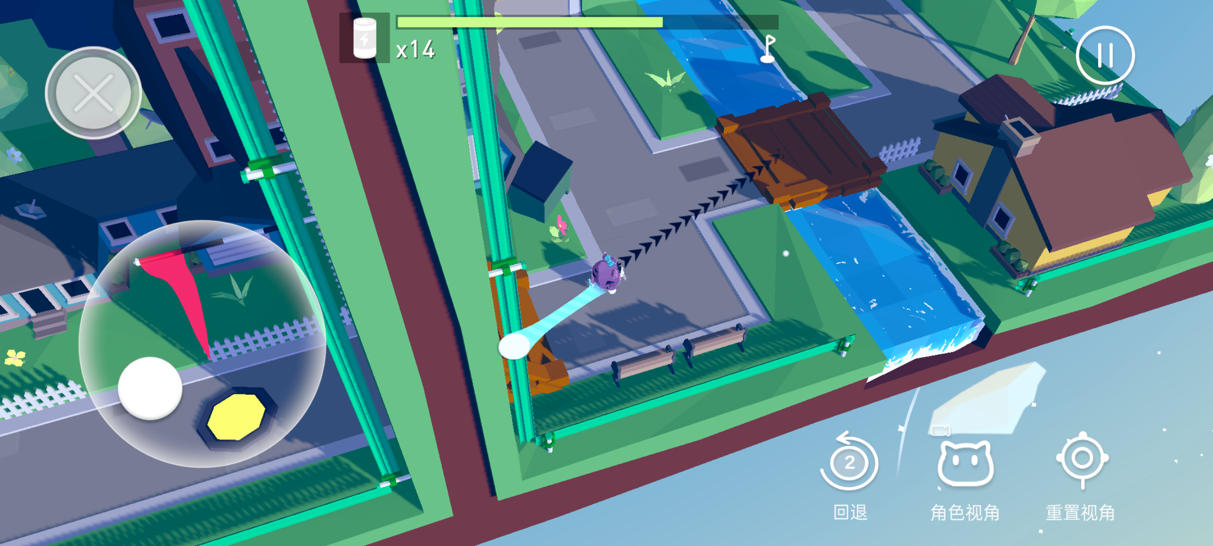 游戏的基本操作并不复杂,玩家扮演一个小猫猫,操纵虚拟摇杆,利用物理学知识控制方向前进,到达终点就通关成功——其实并不用,因为力的作用方向替玩家标好了(如下图虚线所示)。这不比打电子桌球简单?